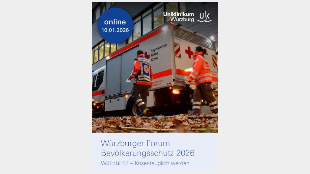 Unter dem Motto „Krisentauglich werden“ laden die Sektion für Notfall- und Katastrophenmedizin der Klinik und Poliklinik für Anästhesiologie, Intensivmedizin, Notfallmedizin und Schmerztherapie des Universitätsklinikums Würzburg gemeinsam mit dem Bezirksverband Unterfranken des Bayerischen Roten Kreuz zum siebten Mal zum rund fünfstündigen digitalen Forum ein. Als Referenten zugeschaltet sind u.a. der Kommandeur des Kommandos Gesundheitsversorgung der Bundeswehr, der Präsident des Bundesamtes für Bevölkerungsschutz und Katastrophenhilfe (BBK) und der Koordinator Sicherheitsforschung des Bayerischen Roten Kreuz.