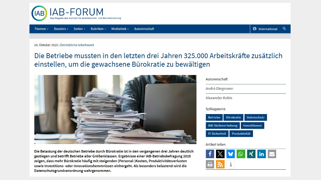 Nürnberg (25. Oktober 2025) – Um die gesetzlichen Vorgaben und Dokumentationspflichten in Deutschland zu erfüllen, hat jeder zehnte Betrieb in den letzten drei Jahren mehr Personal benötigt. Das entspricht 325.000 zusätzlich eingestellten Personen nur für die Bewältigung der Bürokratie. 80 Prozent der Betriebe klagen als Folge der Bürokratie über höhere Kosten. 55 Prozent sehen einen Verlust ihrer Produktivität und 15 Prozent erkennen Wettbewerbsnachteile. Das geht aus der Betriebsbefragung 2025 des Instituts für Arbeitsmarkt- und Berufsforschung der Bundesagentur für Arbeit hervor. Hierfür wurden im ersten Quartal 2025 9.209 Betriebe befragt.