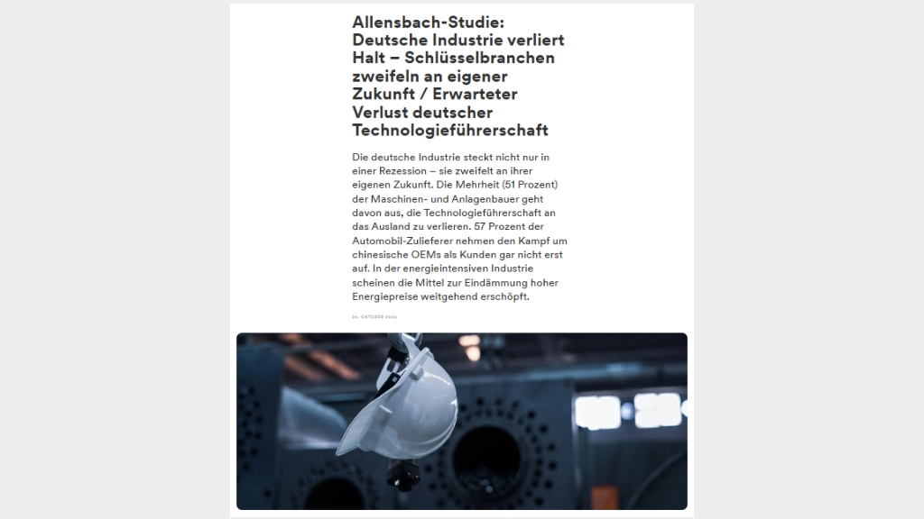 Frankfurt am Main (21. Oktober 2025) – 51 Prozent der deutschen Maschinen- und Anlagenbauer gehen davon aus, die Technologieführerschaft an das Ausland zu verlieren. 57 Prozent der Automobilzulieferer nehmen den Kampf um chinesische Erstausrüster als Kunden gar nicht erst auf. 94 Prozent der Unternehmen in energieintensiven Branchen halten eine Abwanderung von Branchenunternehmen aus Deutschland für wahrscheinlich. Das sind einige Ergebnisse der Befragung von 169 Industrieunternehmen in Deutschland durch das Institut für Demoskopie Allensbach im Auftrag der Unternehmensberatung FTI-Andersch. Interviewt wurden die Vorstände, Geschäftsführer und Bereichsleiter von 64 energieintensiven Industrieunternehmen, 58 Maschinen- und Anlagenbauern und 47 Unternehmen der Automobilwirtschaft.