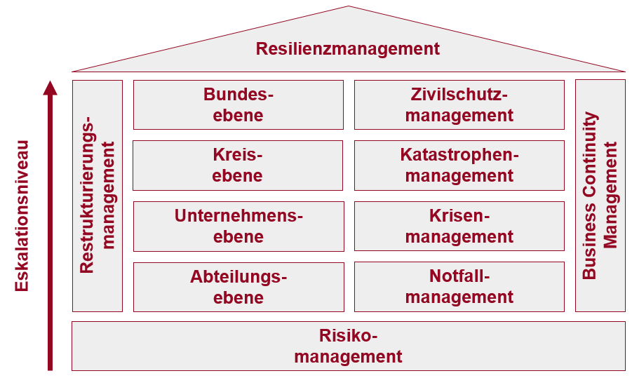 Das Resilienzmanagement umfasst dabei verschiedene Managementmaßnahmen – beispielsweise das Krisenmanagement (gemäß DIN EN ISO 22361), Risikomanagement (gemäß ISO 31000), Business Continuity Management (gemäß ISO 22301 und BSI-Standard 200-4) und Restrukturierungsmanagement. Auf staatlicher Seite kommt u.a. der Bevölkerungsschutz dazu – mit den Komponenten Katastrophenschutz und Zivilschutz.